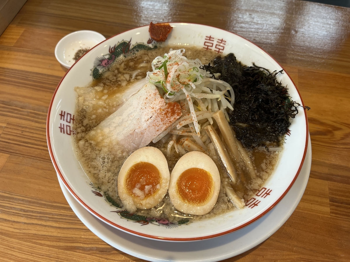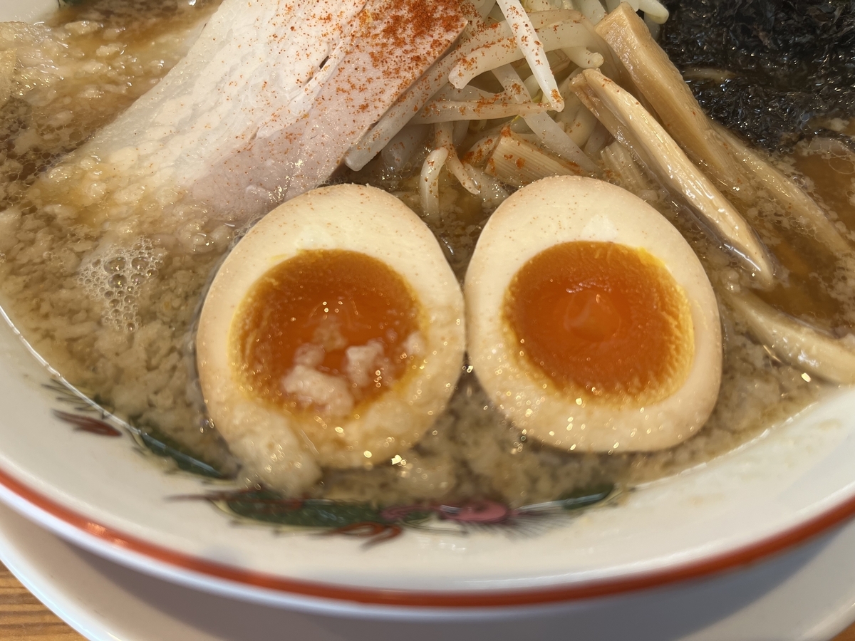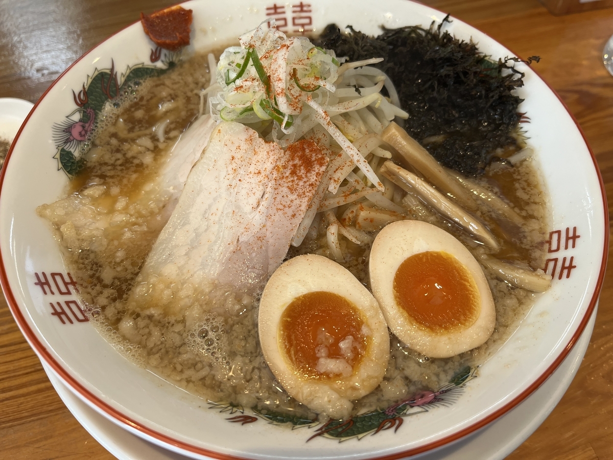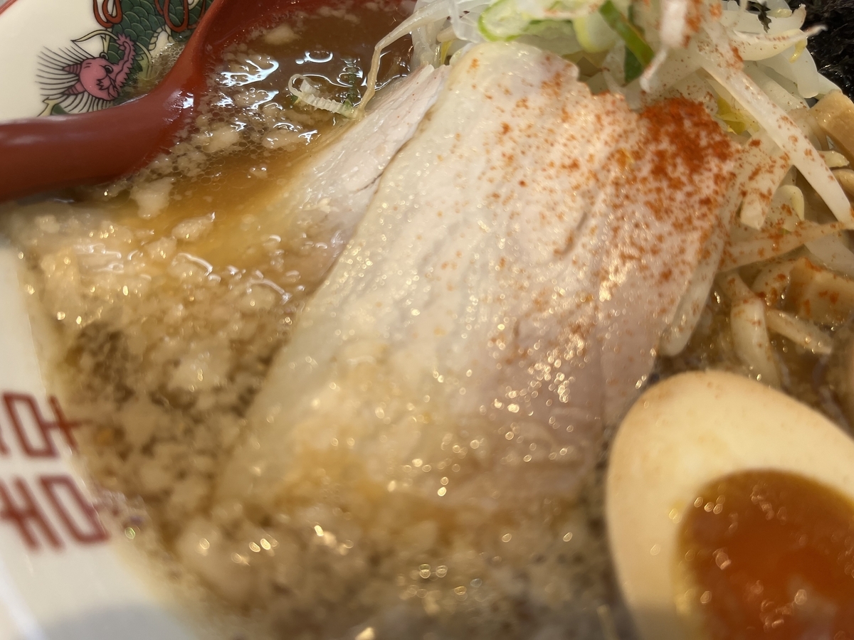 トッピングは得って事でチャーシュー、メンマ、黒バラ海苔、燻玉、もやし、ネギ。